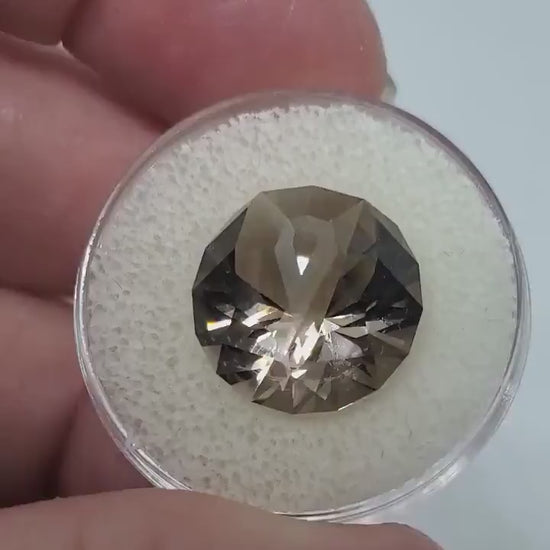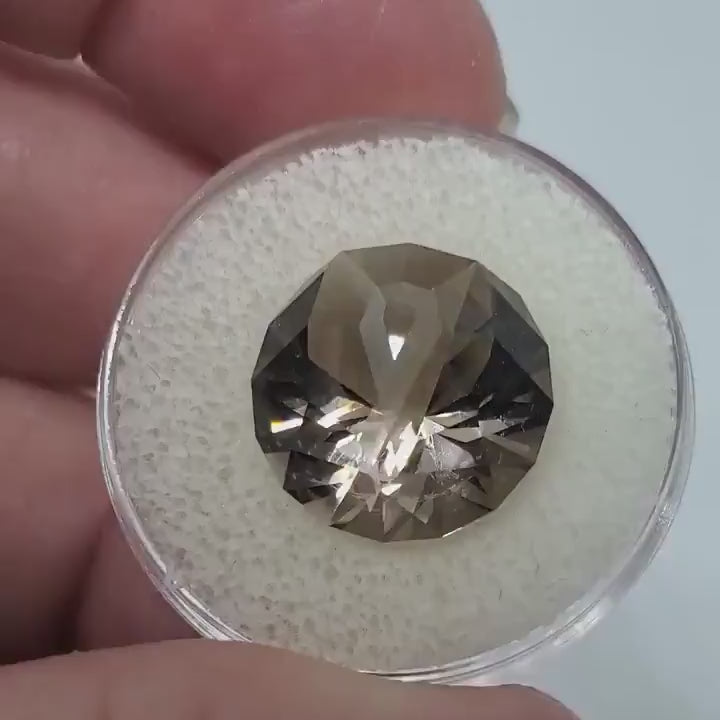 It is a little hard to see in the pictures but this smoky quartz has a ribbon cut into the crown. It is cut in Charles McCoy's The Ribbon cut for all those out there that need a little extra support from their gemstone. It is a sizable piece at 10ct and 14mm so it would be substantial enough for a striking pendant, or a real whopper of a ring. This hand faceted gem would look amazing in either. The smoky is a deep bronze color that would go well with any of the metals you want set it in.