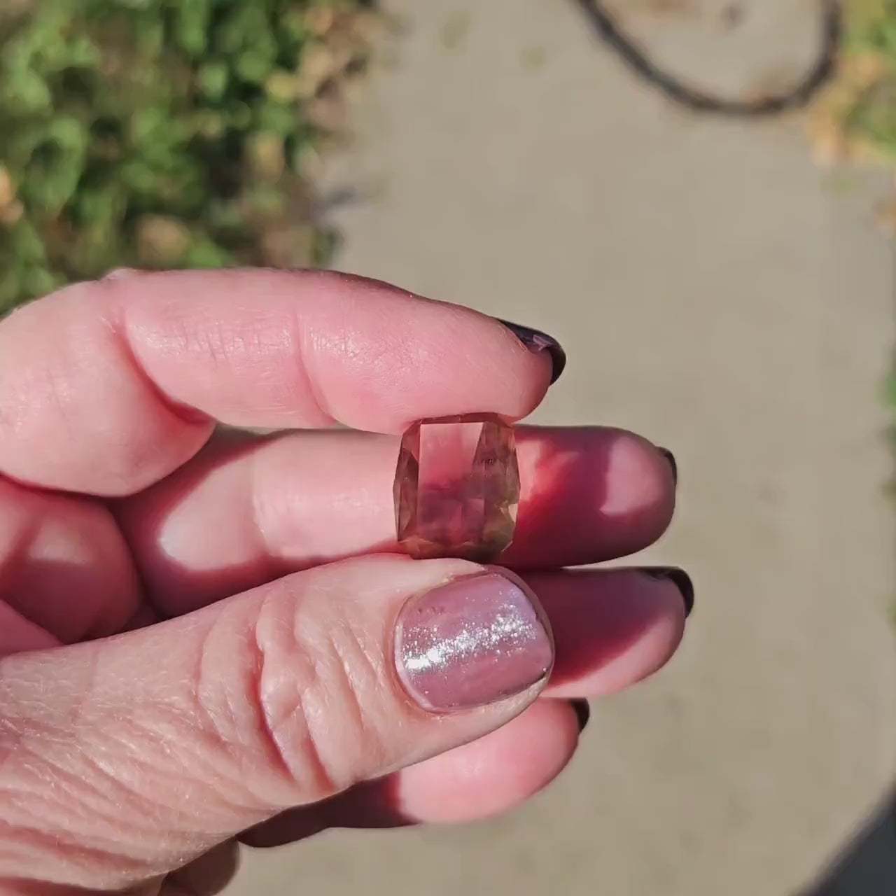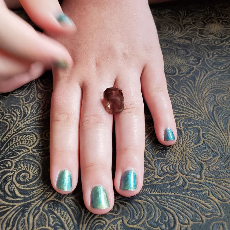This is a once in a lifetime stone you're looking at here. A beautiful faceted Oregon sunstone that shows schiller in the middle and a cherry coke color throughout. With the right light and angle you even get a little green peaking out at you. And did I say it was big? 12.75 carats cut in Arya's Longer and Steelier design. If you are a lover of Oregon sunstone you need to take a long look at this stone. $60 a carat on this one. 12.75ct and 16.1x12.5mm.