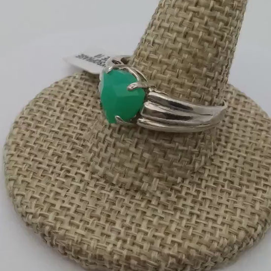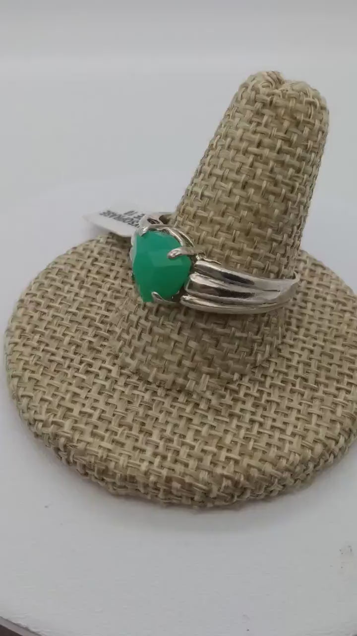 This bright rose cut chrysoprase is in a heart design that will quickly win yours. The green is almost neon in this chrysoprase and it really catches the sunlight. The pretty green will really show off on your finger and is paired with a nice silver band to boot. It is a larger ring at size 10 so keep that in mind.
