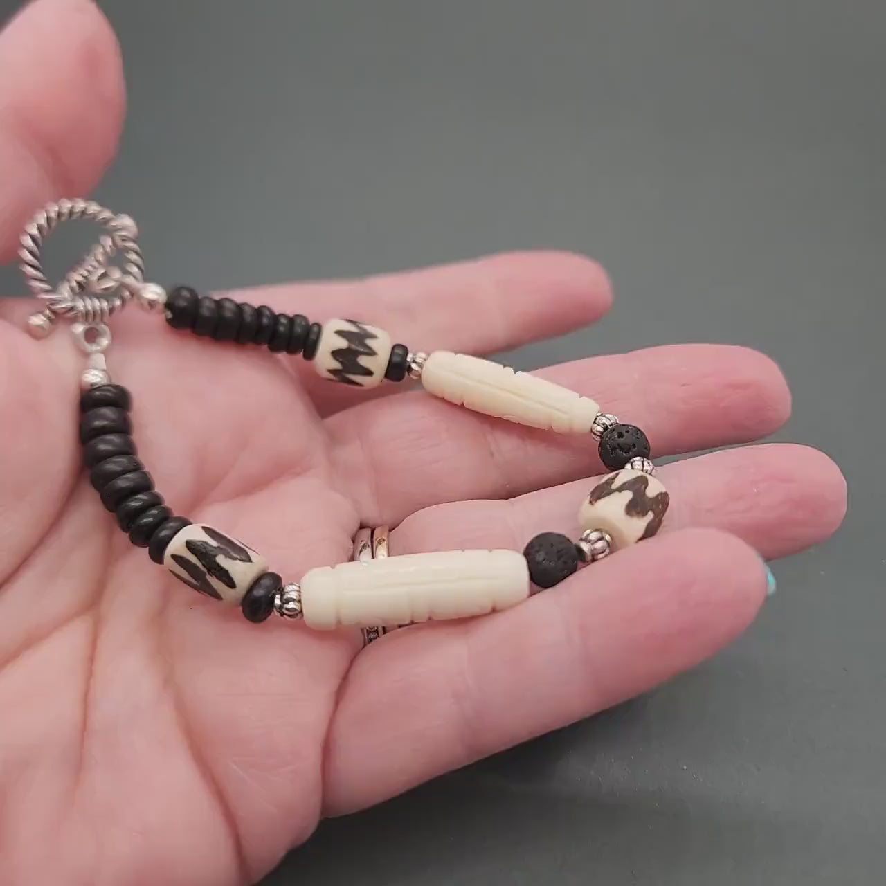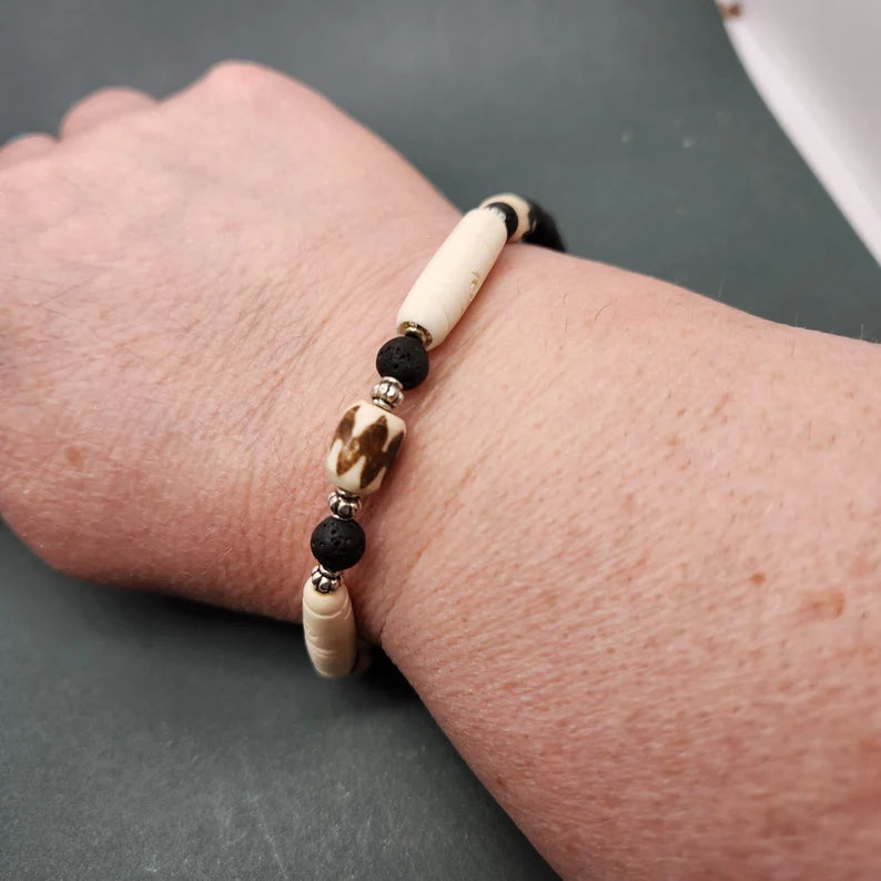 Strung with beads from Ghana and lava beads this bracelet is calling your name. The lava beads will hold a drop of essential oil or perfume to give that nice subtle smell through the day. The pretty white beads from Ghana will draw your eye to the bracelet. Enjoy this bracelet anytime you need to relax.