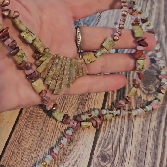 Hand Beaded Rhodonite Rose Quartz and Moonstone Multi Strand Necklace