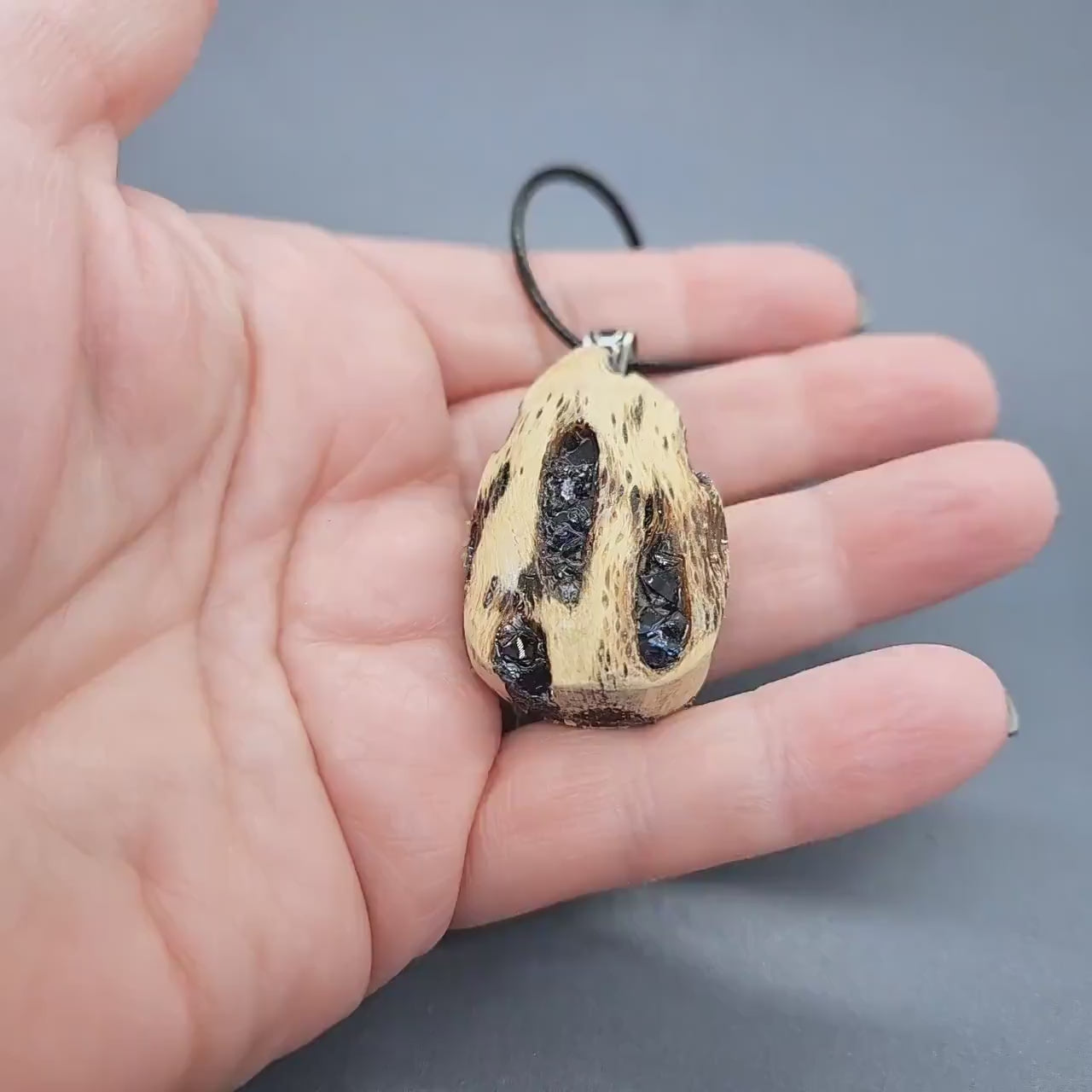 How about a wood necklace to have a little fun with. This cholla wood piece was carved into shape the fissures inlaid with sea glass. Together it makes for a pretty presentation. The light colored cholla wood shows off the sea glass inlay. Wear this when you want something fun. Enjoy.