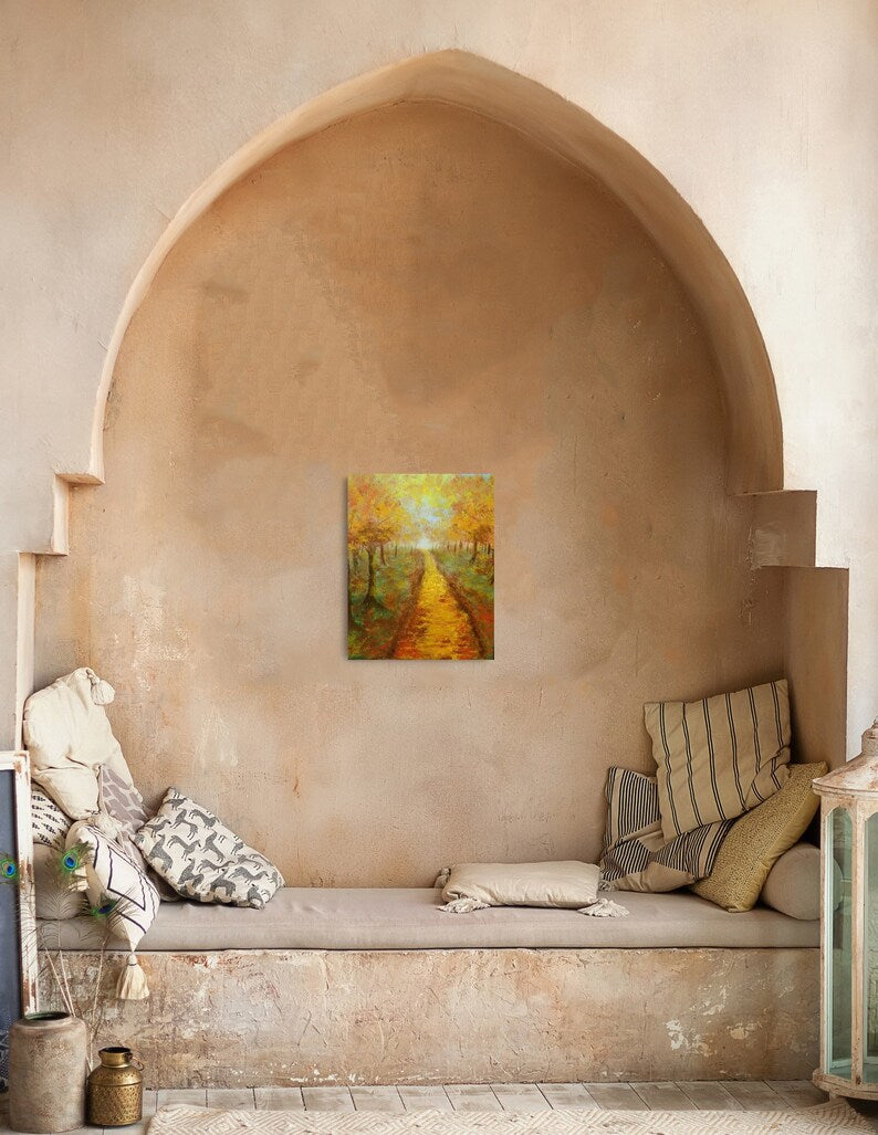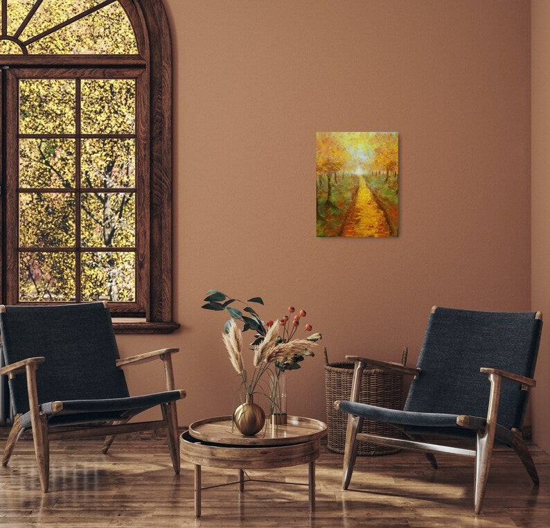 The rich reds, oranges and yellows of a beautiful fall day come to life in this acrylic painting. Path in the Woods describes this so well. You'll feel as though you are taking a stroll along a colorful path. If you need to brighten a room take a look at this pretty painting.
