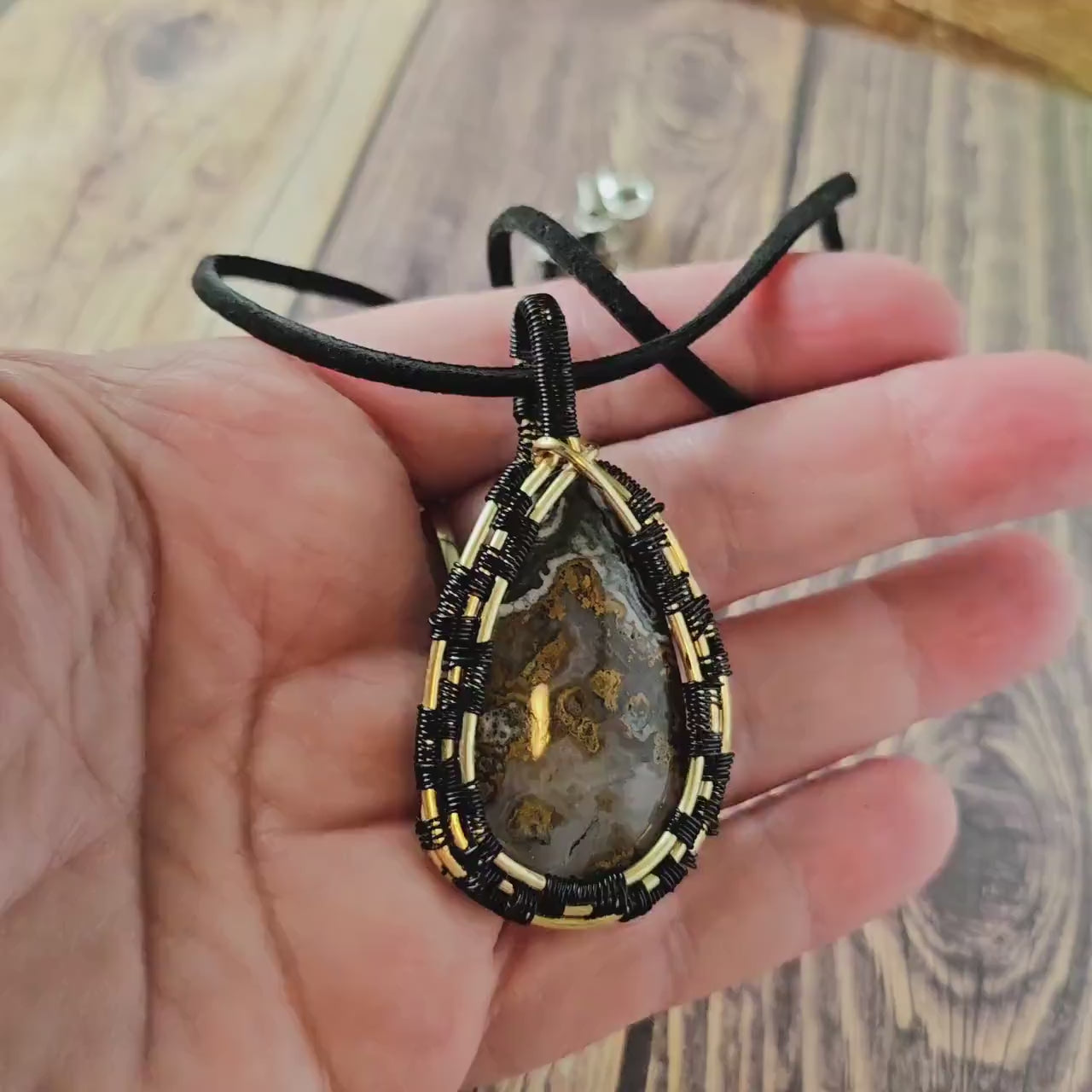 This hand woven necklace is calling to you. The crazy lace agate sits in a black and gold woven wire pendant. The subtle gray and brown of the crazy lace is setoff by the black and gold weaving. It will quickly become your go to necklace.