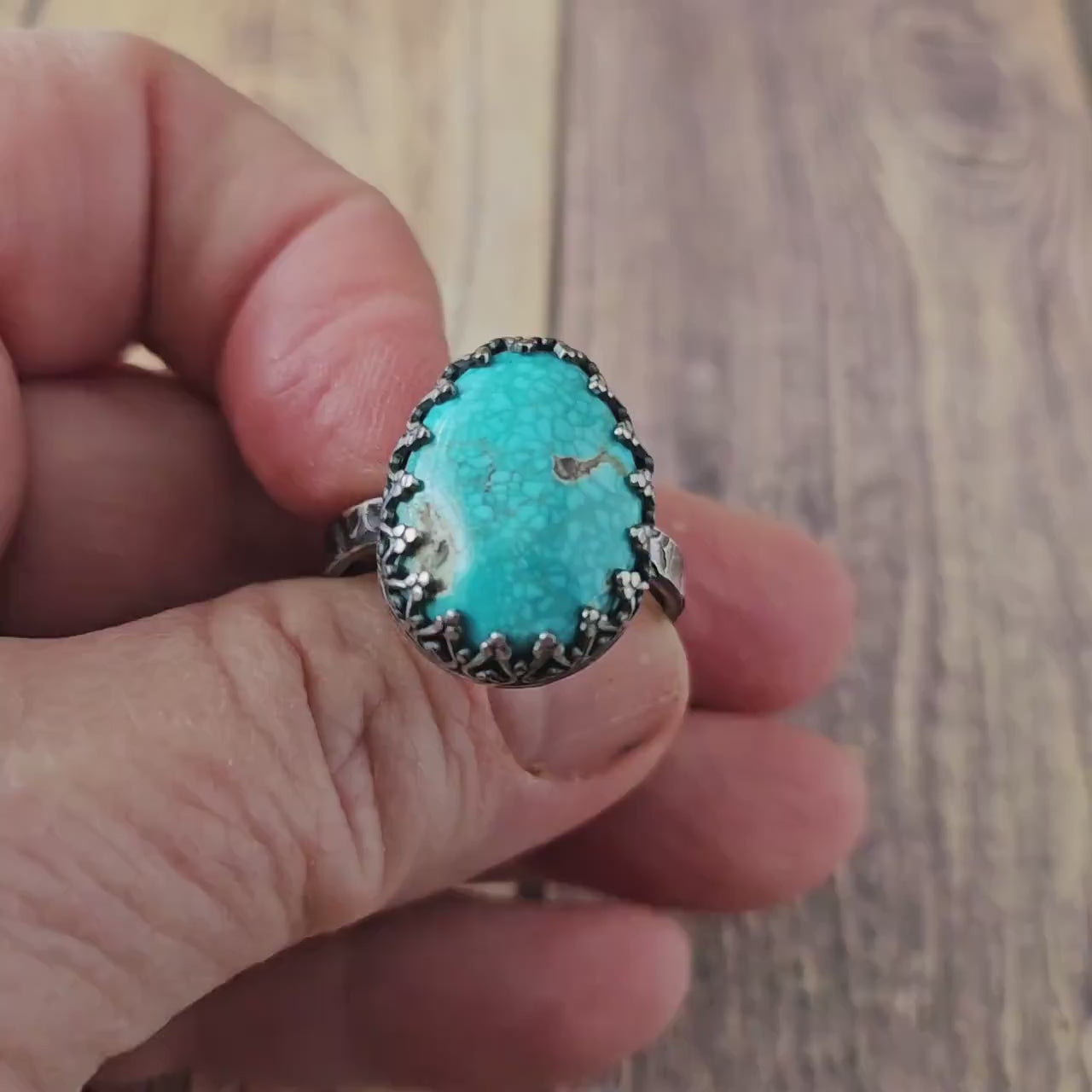 The fancy crown bezel on this ring holds a pretty 11ct turquoise. You'll fall in love with this ring the first time you try it on. The dark patina that was applied to the silver ring makes the blue of the turquoise pop. Add this to your collection and smile every time you put it on. Enjoy!