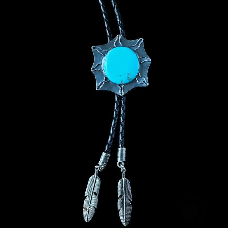 The hand cut 40ct Sleeping Beauty turquoise stone adds the allure of olden days to this bolo tie. The turquoise sets off a sun motif silver pendant that you will be proud to wear. It will show off your style quite well.