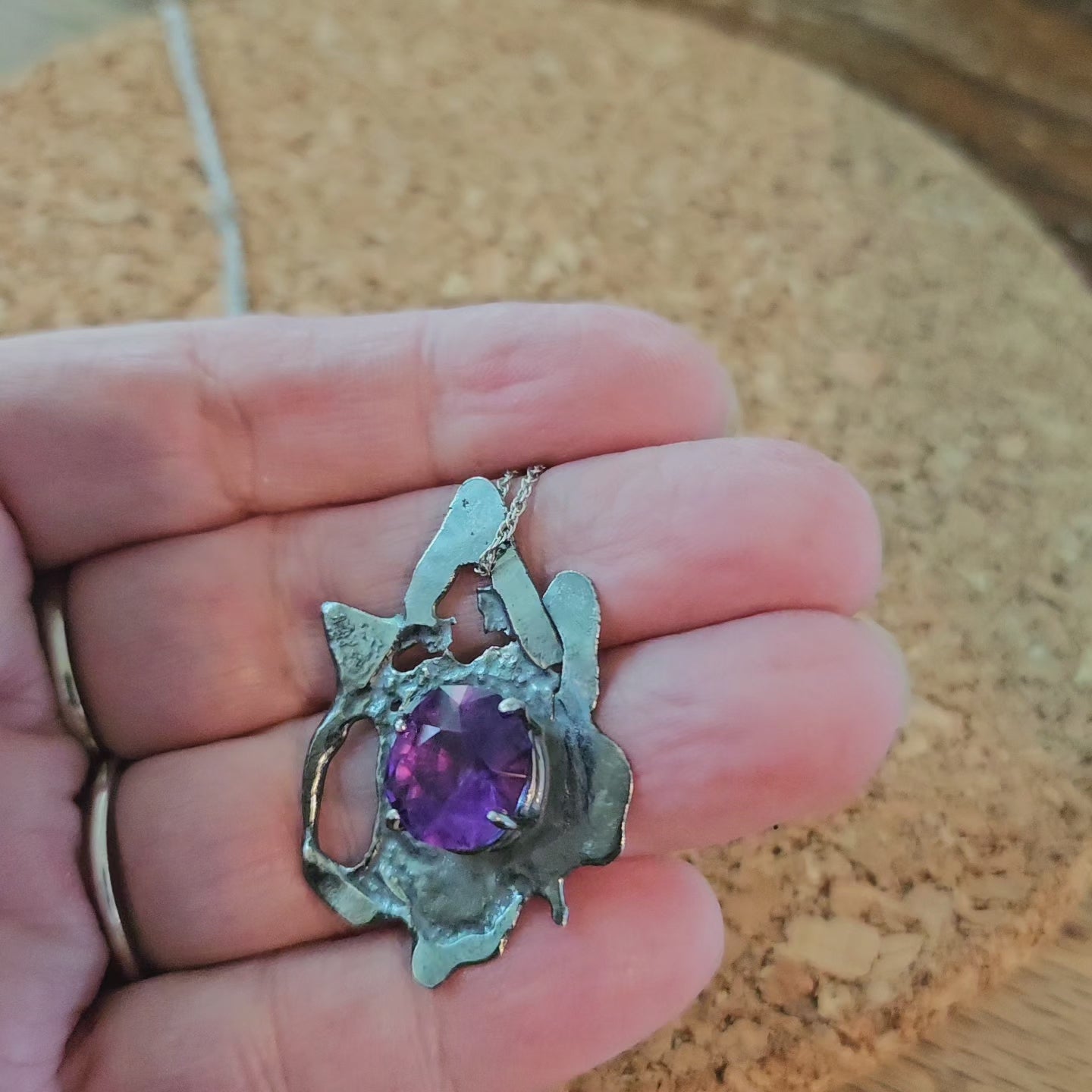 Handcut Amethyst Talisman Necklace Brutalist Sterling Silver Pendant Mystic Artisan Jewelry