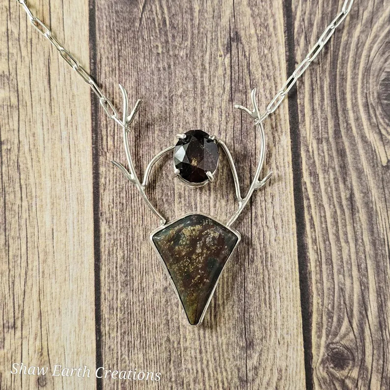 A fantasy piece to fill our your collection. This stag themed hand fabricated silver necklace will look incredible hanging around your neck. The bloodstone shows a mix of fall colors and is setoff by a faceted oval garnet above. The mix makes for an impressive designer piece of jewelry that you will love for years to come. Enjoy!