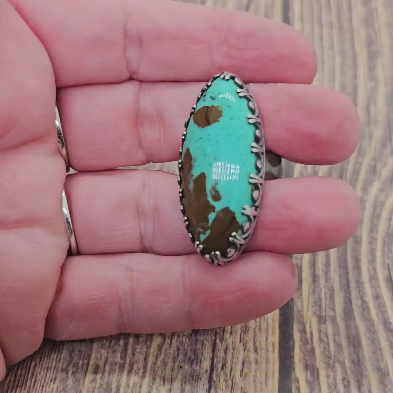 This beautiful gem silica ring is waiting for you to fall in love with it. The hand cut gem silica sits in a fancy silver bezel. It is a large ring and will cover a lot of finger. A patina has been applied to make the silver dark. It gives the ring an enchanting look. Enjoy!