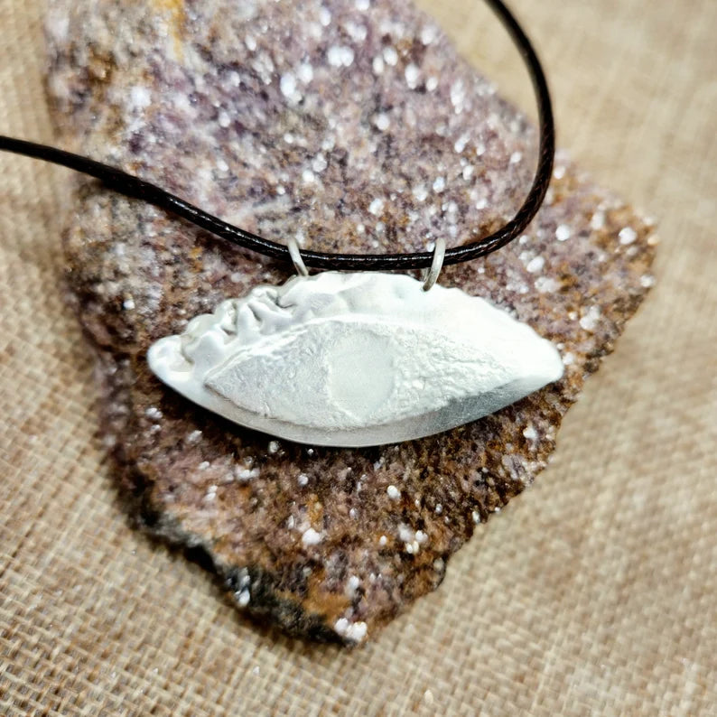 This hand faceted green tourmaline marquis cut sits as an iris in the alluring fabricated silver eye. The silver is fabricated to look like an eye, with lashes and all. It has the pretty green tourmaline attached in the middle to make this whole piece look like a mystic eye. Definitely a unique, one of a kind jewelry piece that you will love to pull out for special occasions. If you need a little third eye help this piece should fit the bill.