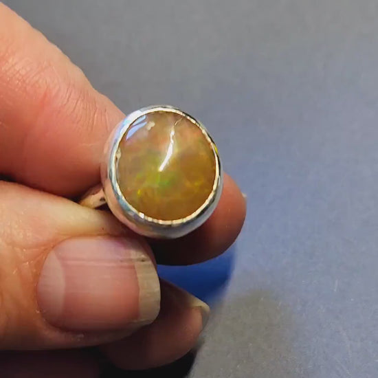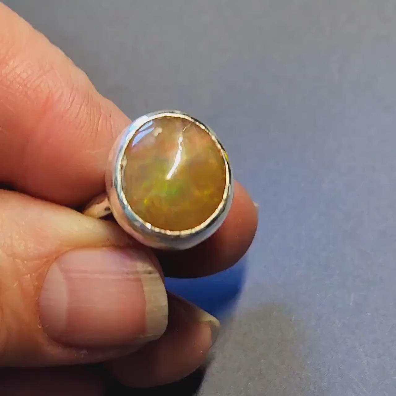 You'll love the enchanting colors coming out of this Ethiopian opal silver ring. The hand cut opal shows a pretty honeycomb pattern with loads of color. Take this beauty into the sun and your eyes will get bigger and bigger. It will quickly become your go to ring when you need something classy on your finger. Enjoy!