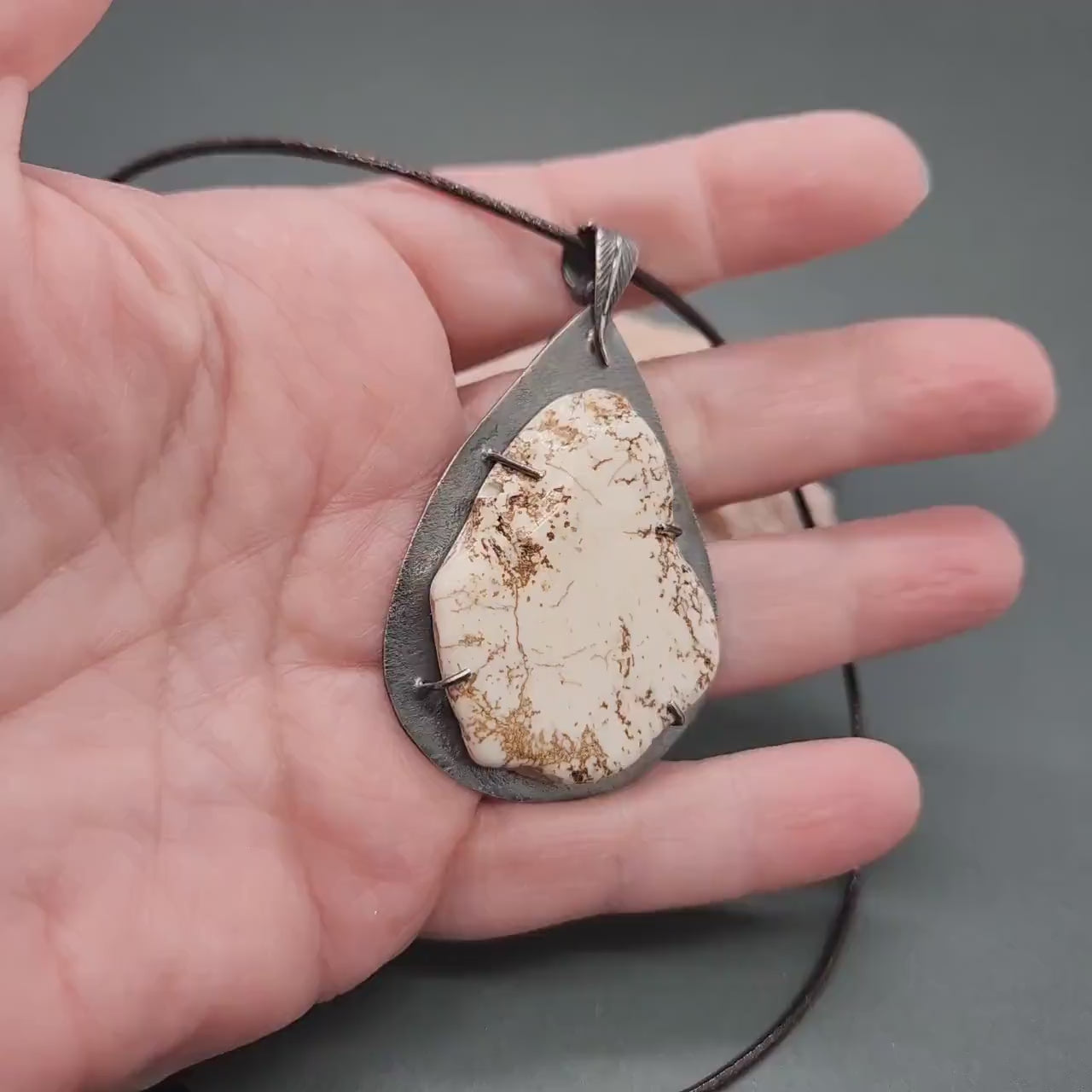 You need something interesting to jazz up your jewelry collection. This handcut, hand fabricated chunk of howlite prong set in a silver mount will definitely be unique in your collection. The semi-open back silver lets the pretty howlite to be seen from the back as well as the front. The silver has a heavy patina applied that brings it to almost a bronze color. The dark silver really shows off the white of the howlite.