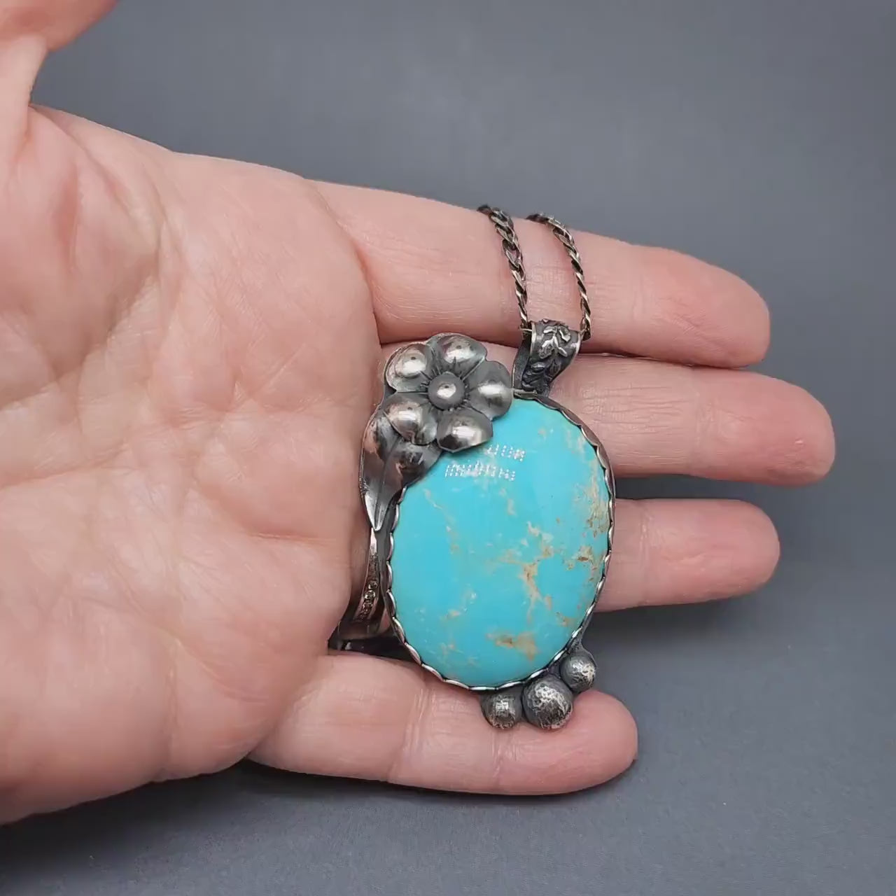 Turquoise lovers take note of this beautiful piece. This large Kingman turquoise just jumps out at you it is so blue. It is bezel set in a pretty silver setting with silver beads for accent. It makes for a stunning presentation. Enjoy this hand cut Kingman turquoise whether you love turquoise, or just love a pretty necklace.