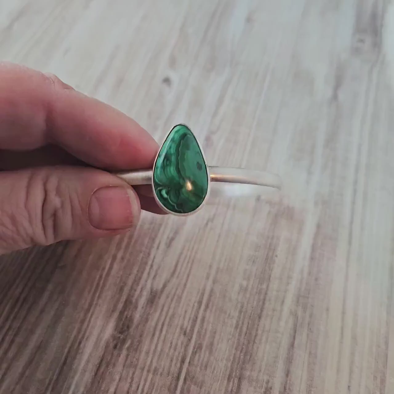 Malachite makes such a stunning presentation. The deep green with even deeper green highlights really catches the eye. This hand cut pear shaped malachite is set is a pretty silver bezel on a silver bangle. Hang it around your wrist and enjoy the calming green malachite every day.