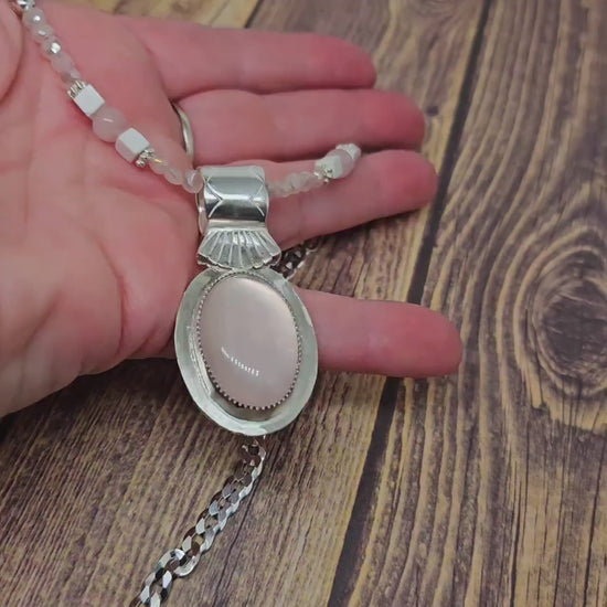 The subtle pinks of the hand cut rose quartz cabochon and the quartz bead accents make this such a pretty necklace. This would look fantastic on a dark top. The pinks will pop and be accented by the silver surrounds. This will quickly become one of your favorite pieces. Wear it out on the town or do a little dress up for work.