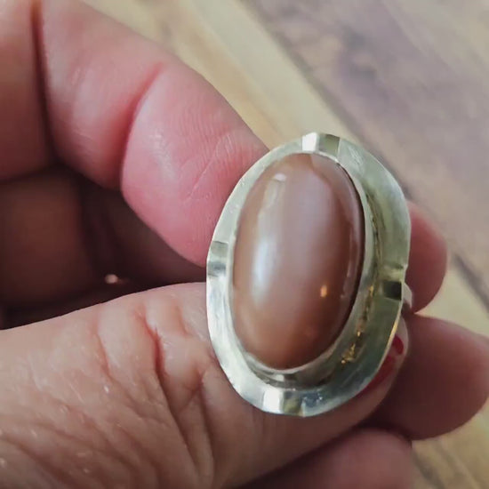 Move this tawny moonstone in the light and you can see the shimmer flow across the stone. This large moonstone silver ring definitely demands some attention. You'll have fun answering the questions about this pretty hand cut moonstone ring.