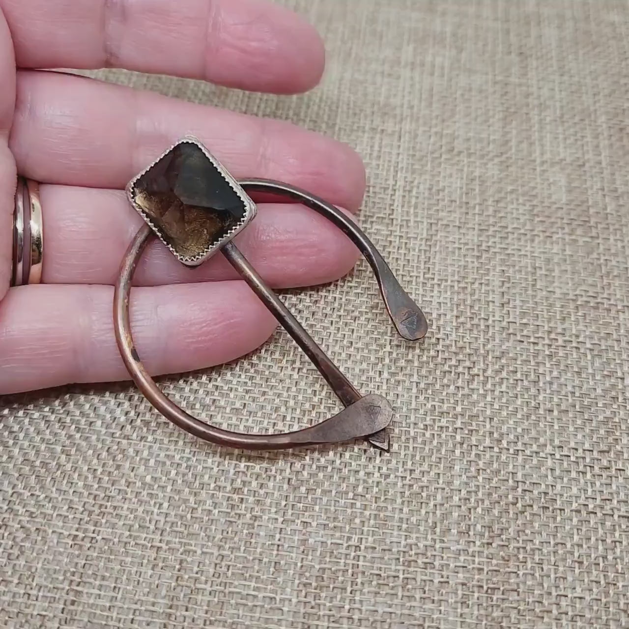 Want the perfect accessory for your favorite scarf? Your Celtic kilt? Your Renaissance or cosplay outfit? This handmade copper cloak pin is perfect. It has been hand forged and antiqued to show rich texture and age. The Apache Tear stone has been hand faceted, and was added to give it shine and sparkle. It is easy to use, and looks great on you! Handmade in the USA. WE CUT ALL OUR OWN STONES! We travel the US and mine our own gemstones. We cut those and other gemstones ourselves, then hand forge silver, copper, and other metals to create our own unique designs. Each piece is one of a kind, and a treasure to wear.
