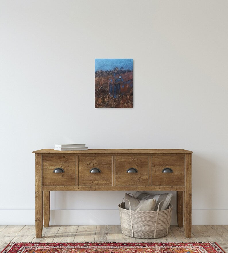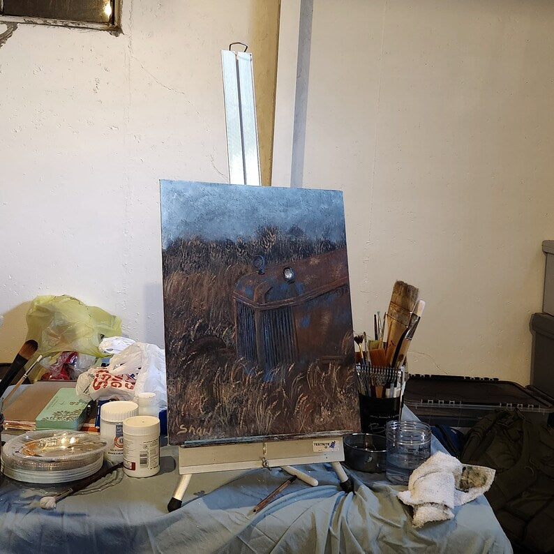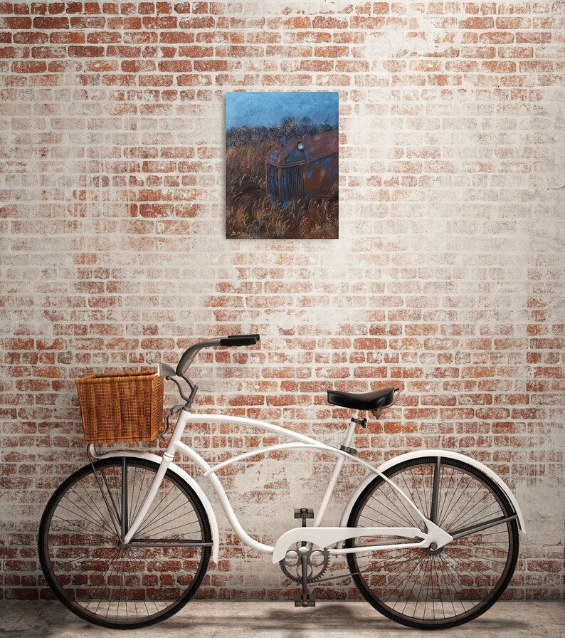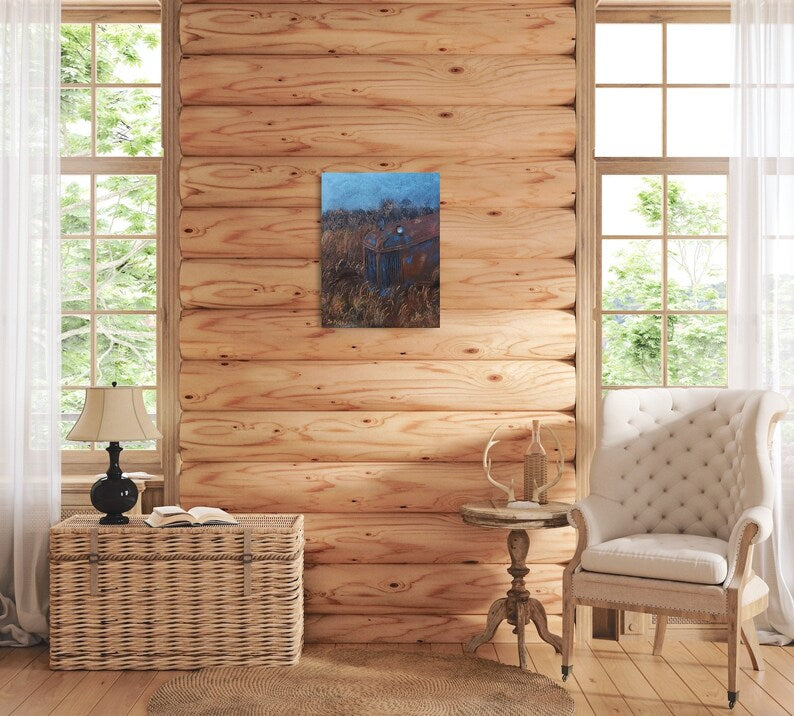 The tired old tractor is sitting in a field of grass. It may look like it is rusting away and forgotten but this old tractor has so many stories to tell. You'll want to put this on your wall and figure out everything this good old tractor has to tell you. It is hand painted with acrylics on a canvas board. It will need to be framed after you get it home. Enjoy the subtle shades of brown and blue in this painting of an older time.